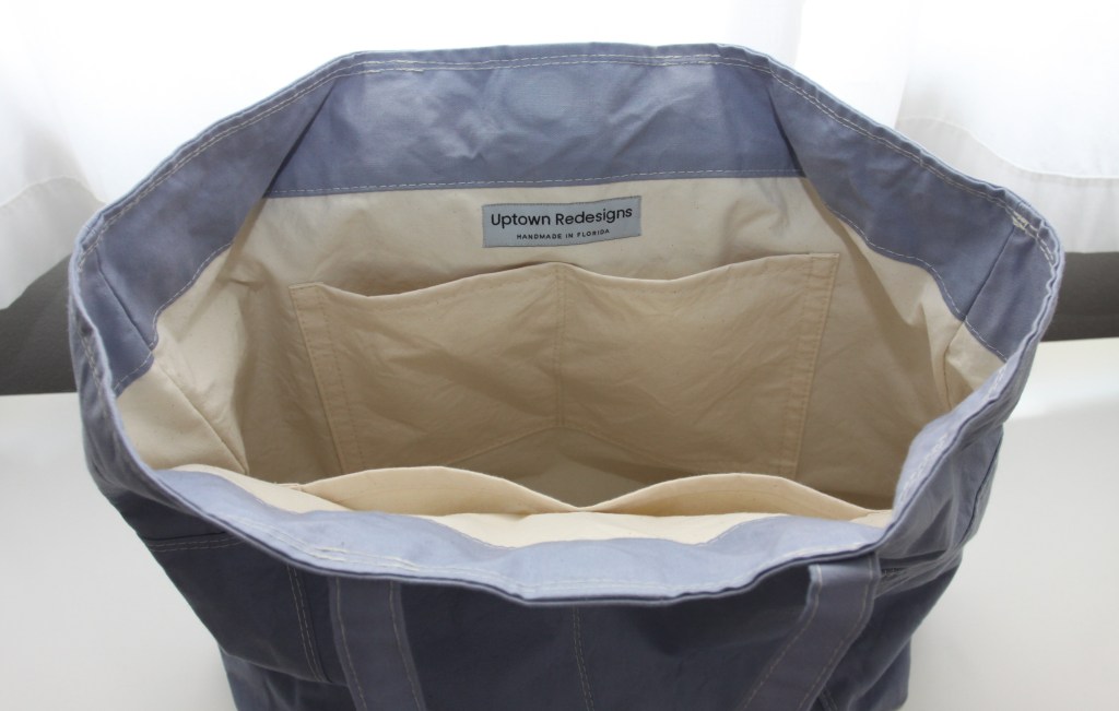 Interior lining: Neutral off-white cotton 10 oz canvas; one pocket on each side