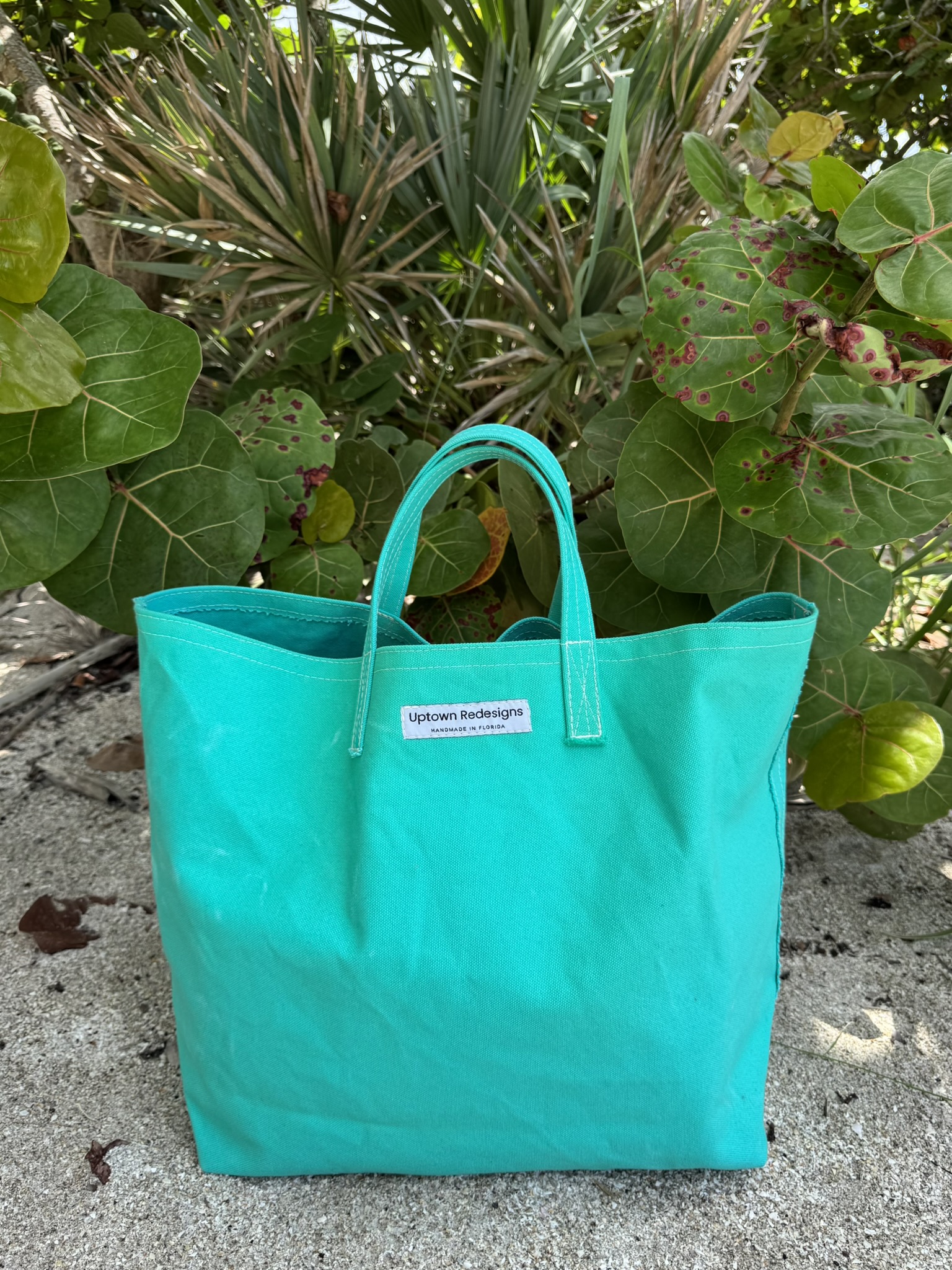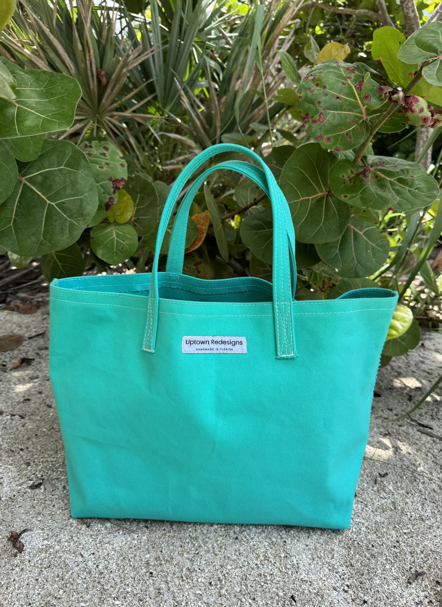 Practical and beachy! Simply constructed from very thick canvas (and not much else – no lining), these bags are perfect for lazy beach days, grocery shopping, and general hauling of all things everywhere. Inspired by the colors of the gulf waters, these teal totes are built to last and are ready to weather and fade over time to become your go-to favorite. Available in two sizes/styles: